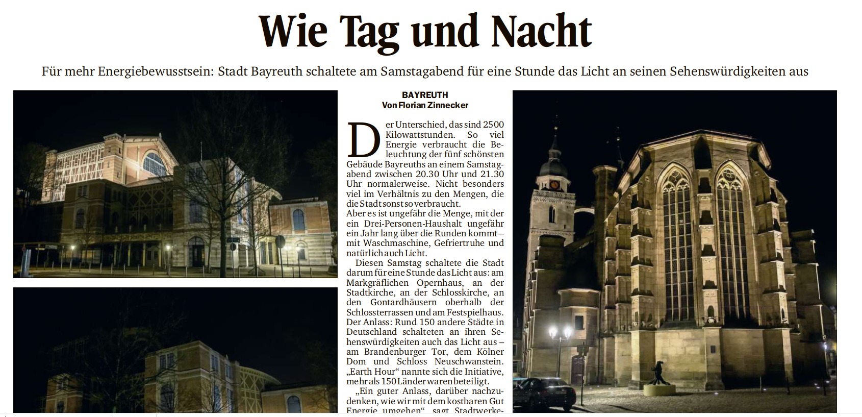 Wenn die Lichter ausgehen, hat das einen Sinn. Über die Earth Hour für mehr Energiebewusstsein berichtete der "Nordbayerische Kurier" vor 10 Jahren am 31. März 2014.
